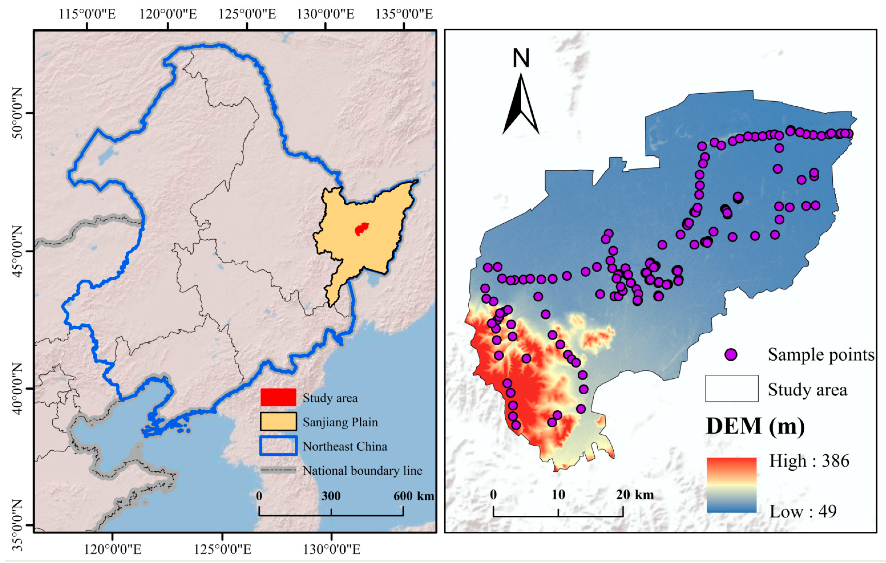 In summary, although DSM has made considerable progress across various regions and scales, existing studies have rarely systematically considered the effects of interannual climatic variability on the accuracy of remote sensing-based SOM predictions. In particular, the adaptability and functional mechanisms of multi-temporal image combination strategies, environmental covariates, and feature selection under different climatic conditions remain unclear in typical farmland ecosystems. This research gap can be attributed to three key constraints: First, historical DSM studies have often prioritized spatial variability of SOM while treating temporal dynamics as a secondary factor—many studies focus on single-year or short-term datasets, assuming relatively stable climatic conditions over the study period, which overlooks the modulatory role of interannual climate fluctuations on soil–vegetation spectral responses. Second, data availability and consistency pose practical challenges: Long-term, high-quality remote sensing datasets are often scarce, especially for regions with frequent extreme weather; meanwhile, matching multi-year remote sensing data with synchronous in situ SOM samples requires substantial labor and resource investment, which limits large-scale systematic investigations. Third, methodological limitations in integrating climate variability: Traditional machine learning models for DSM are often optimized for specific climatic conditions and lack adaptive frameworks to quantify how interannual changes in temperature/precipitation alter the predictive power of remote sensing features. To address this gap, this study focused on Youyi Farm in the Sanjiang Plain and selected three representative climatic years: 2019 (flood year), 2020 (normal year), and 2021 (drought year). By integrating multi-temporal Sentinel-2 imagery, environmental factors, and a RF model, we systematically evaluated the mapping performance of single-period and dual-period image combinations, examined the contributions of environmental covariates and feature selection to model accuracy and stability, and revealed the spatial distribution patterns of cropland SOM under different climatic conditions. Notably, this study innovatively links interannual climatic variability to the optimization of remote sensing temporal combinations for SOM mapping, avoiding the “one-size-fits-all” limitation of traditional fixed-period strategies. It also proposes an RF-RFE feature selection framework tailored to complex climatic scenarios, which enhances the robustness of SOM prediction by adaptively screening key features across flood, normal, and drought years. This study aims to refine the methodological framework for SOM mapping under complex climatic scenarios, providing both theoretical guidance and practical references for multi-year cropland quality monitoring, agricultural management, and carbon sink assessment.
