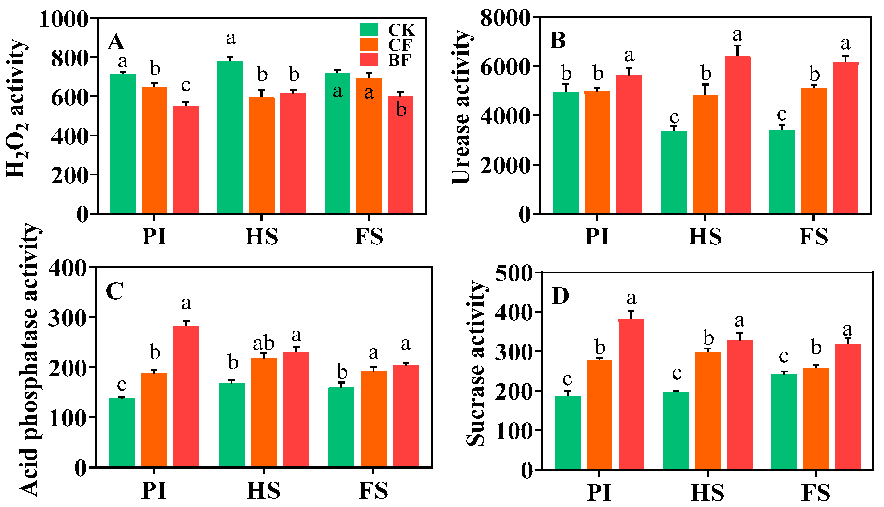 - Wang, J.; Sun, L.J.; Sun, Y.F.; Yang, S.; Qin, Q.; Xue, Y. Integrated enzyme activities and untargeted metabolome to reveal themechanism that allow long-term biochar-based fertilizer substitution improves soil quality and maize yield. Environ. Res. 2025, 270, 120935. [Google Scholar] [CrossRef] [PubMed]