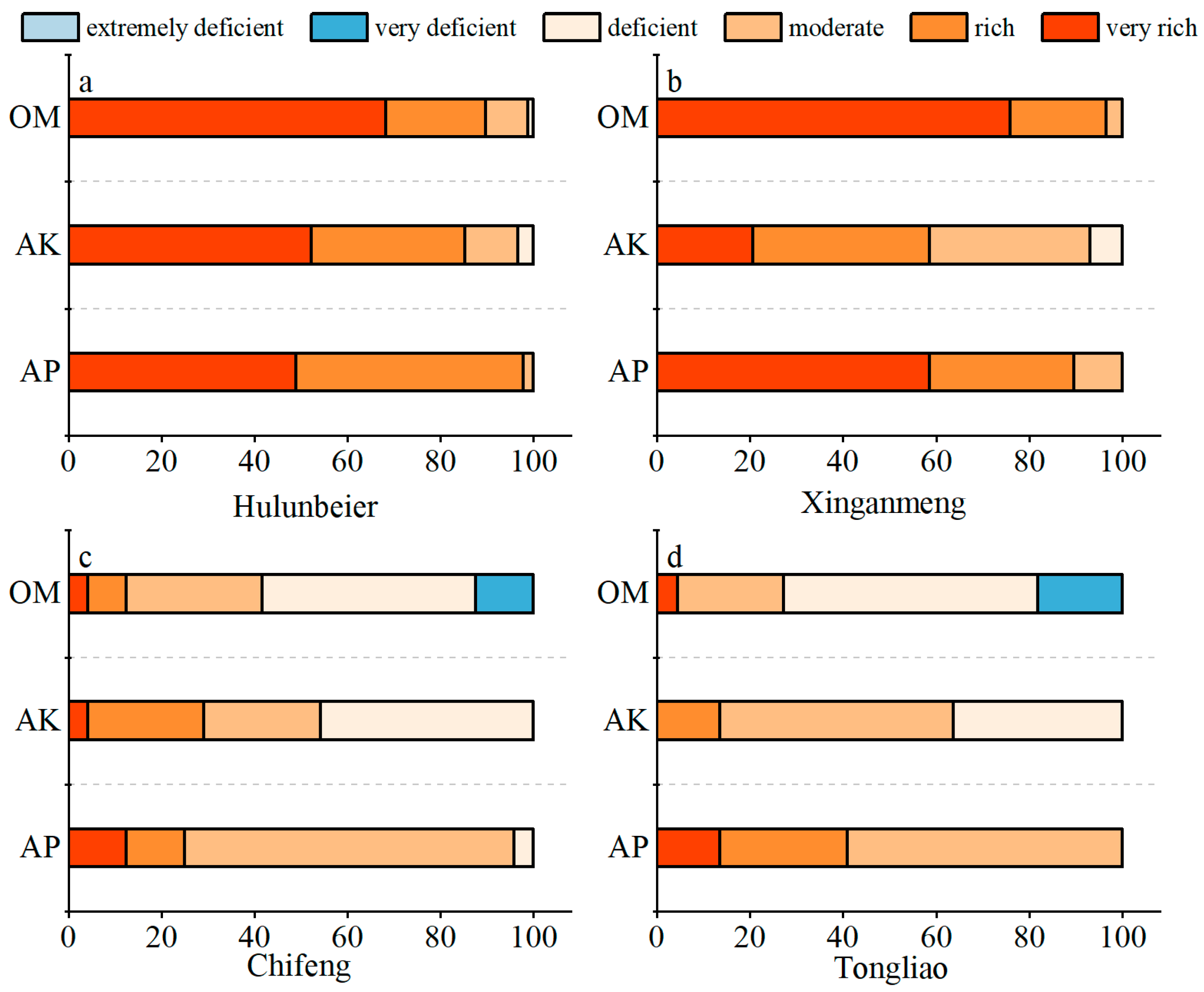 From 5 to 22 August 2023, a total of 163 composite topsoil samples (0–20 cm) were collected from agricultural fields across the four prefectures of Hulunbeier, Xing’anmeng, Chifeng and Tongliao. At each sampling site, four subsamples were taken along a short diagonal within a ~10 m × 10 m plot and thoroughly homogenized in the field to obtain approximately 1 kg of soil as one composite sample representing that site. Soil samples collected from the field were immediately returned to the laboratory on separate trays, stripped of leaves, weeds, debris, and other foreign matter, and left to dry naturally in a ventilated, sunny, and light-protected area. The samples were air-dried at room temperature, ground, and sieved through a 100-mesh soil sieve and a 2 mm soil sieve, then preserved for analysis. GPS was utilized to accurately locate each sampling point (