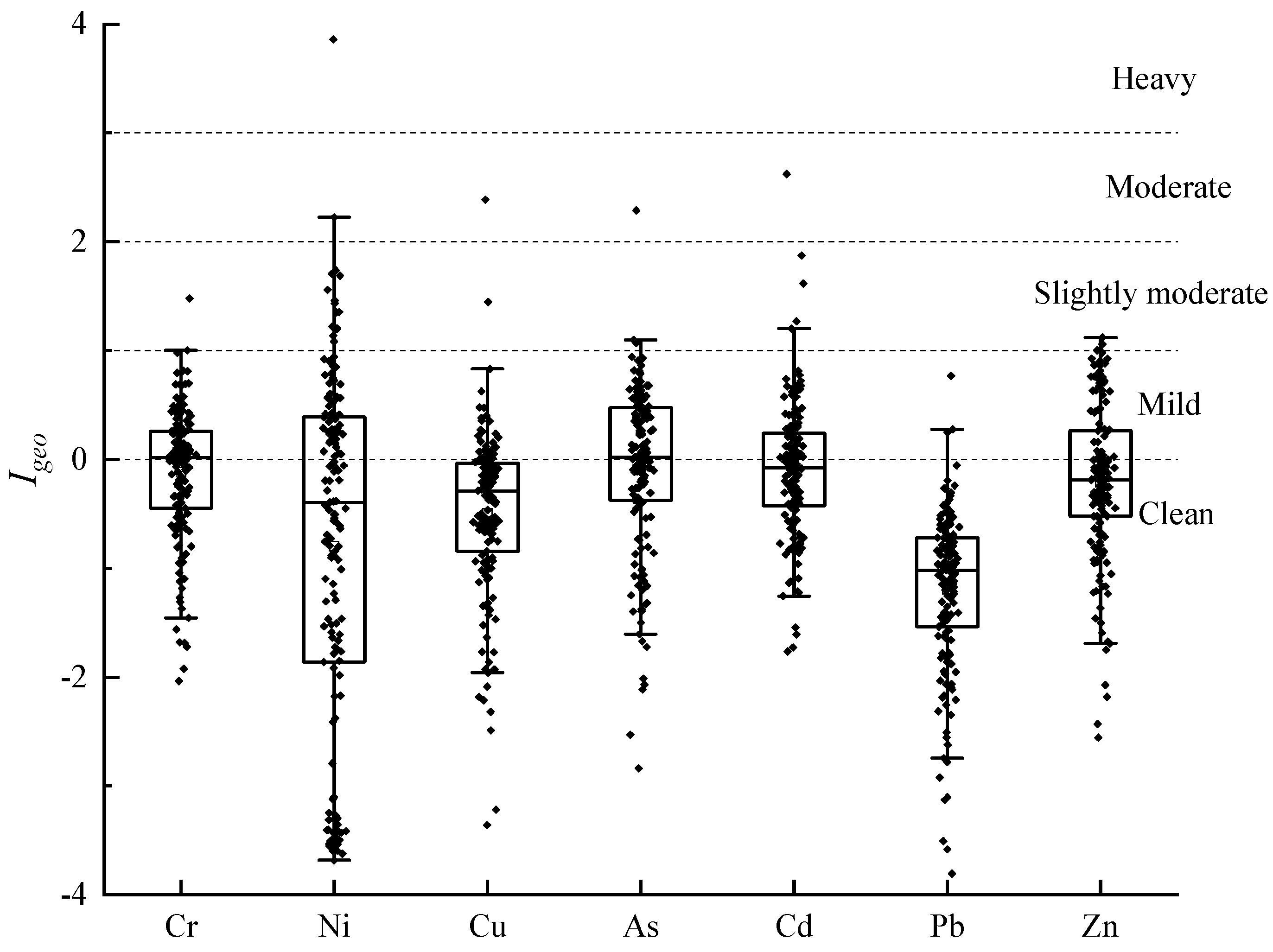 Igeo) was proposed by the German scientist Muller and is widely used to evaluate the degree of contamination of soil and sediment with heavy metals [