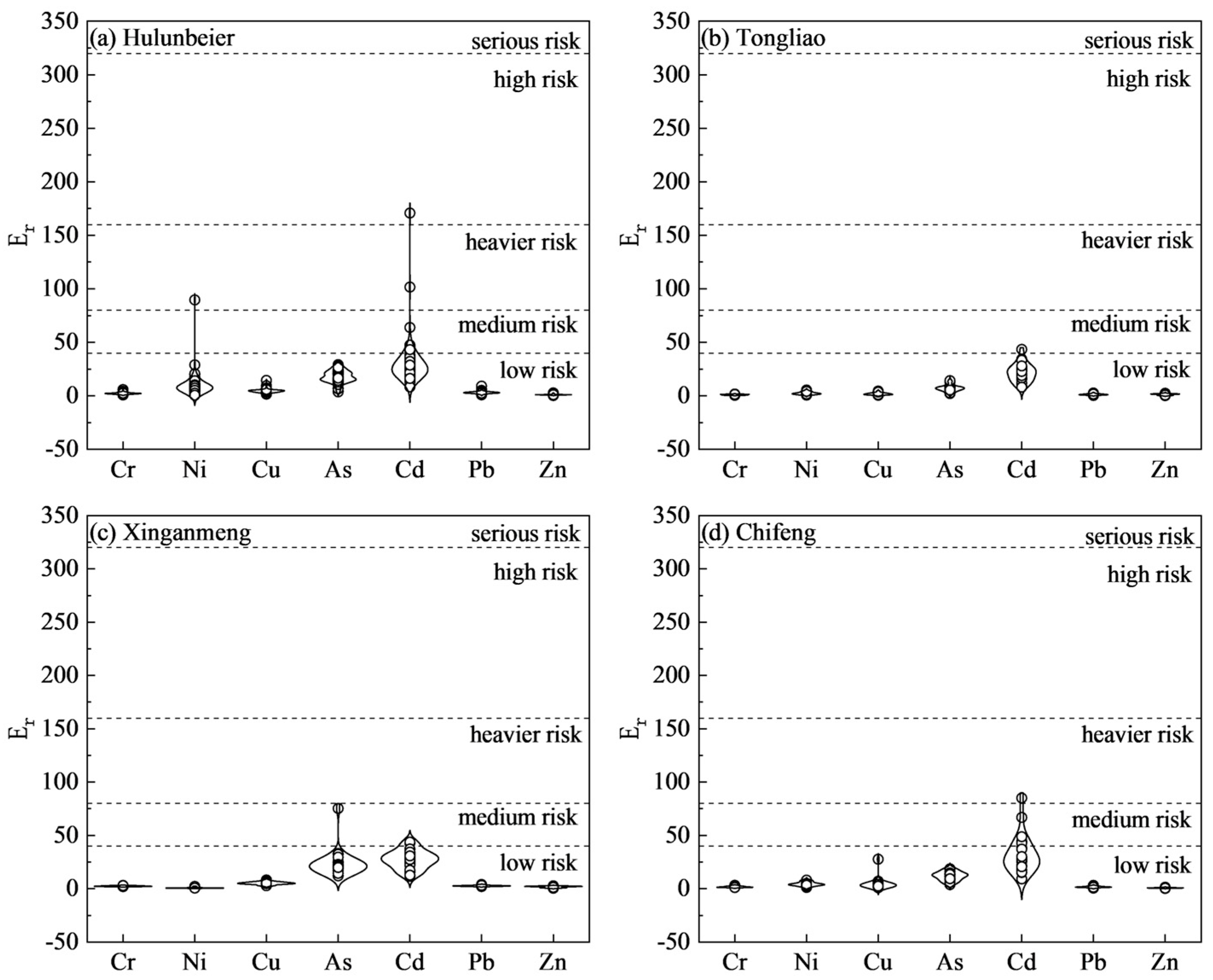 −1). The toxicity response factors for heavy metals were set as Cr = 2, Ni = 5, Cu = 5, As = 10, Pb = 5, Zn = 1 and Cd = 30 [