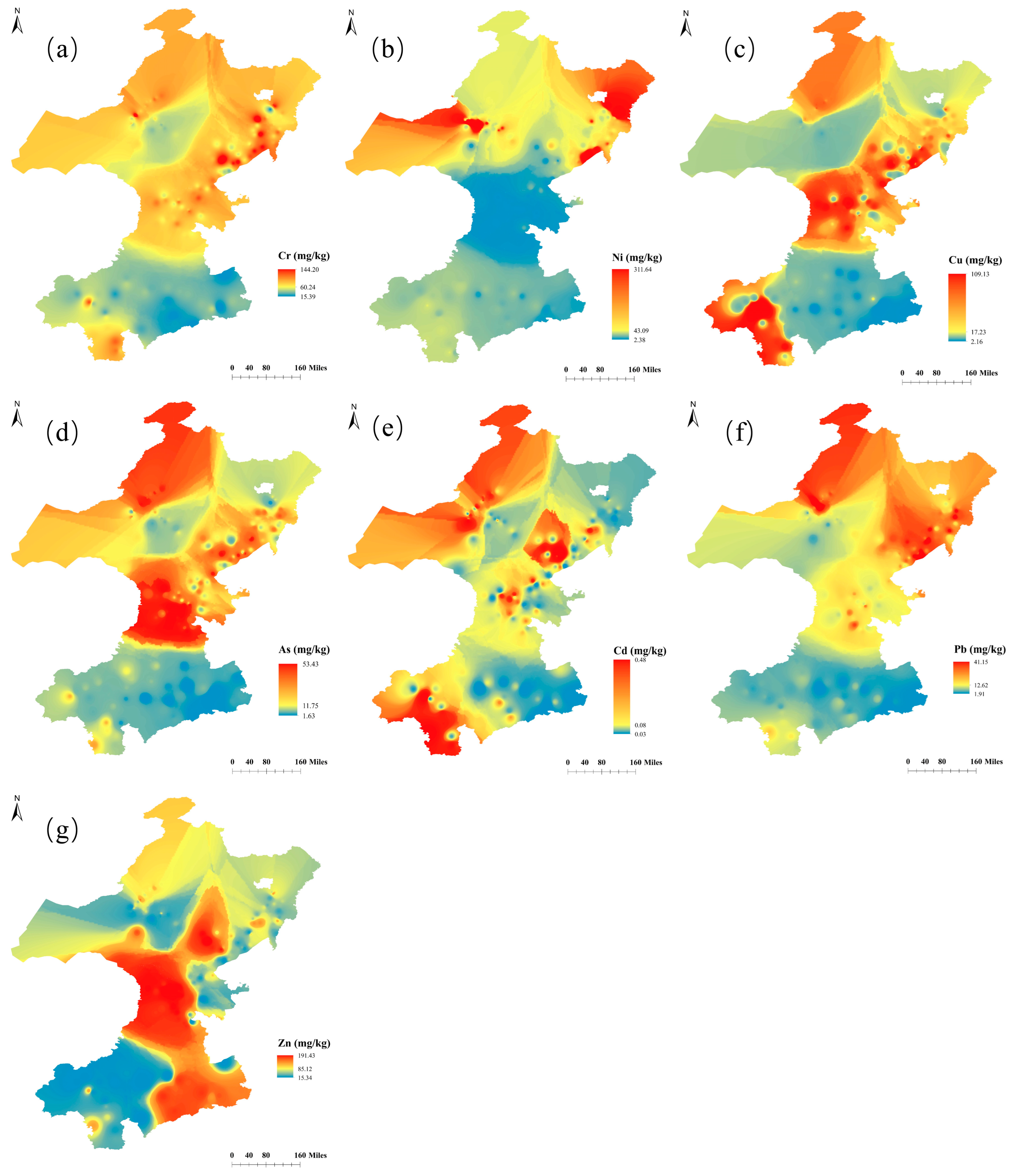 - Zeng, Q.; Fu, T.; Zou, H.; Teng, L.; Wu, K.; Xie, T.; He, T. Characteristics of spatial distribution and source analysis of soil heavy metals in chilli cultivation area in a county of Guizhou Province. J. Agric. Environ. Sci. 2021, 40, 102–113. [Google Scholar] [CrossRef]