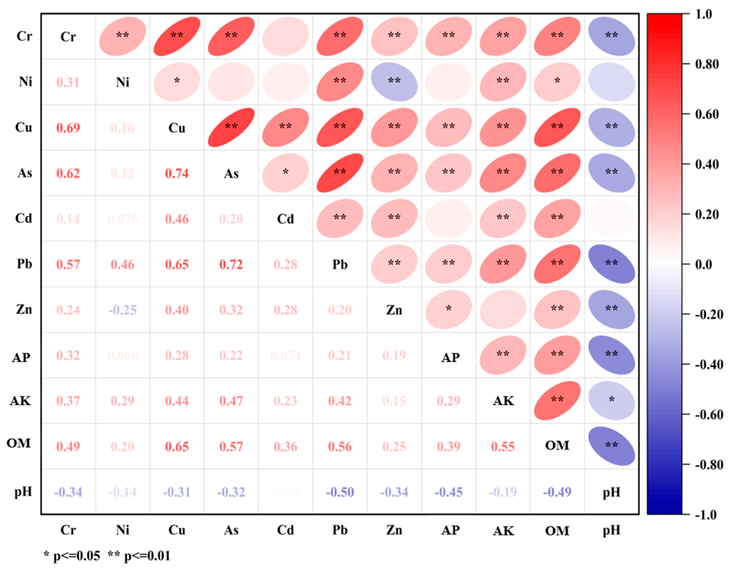 (1) The mean concentrations of Cr, Ni, Cu, As, Cd, Pb, and Zn in the study area were 61.77, 26.77, 17.07, 12.11, 0.08, 12.61, and 85.71 mg/kg, respectively. Compared with the screening values in GB 15618-2018 Soil Environmental Quality—Risk Control Standards for Soil Contamination of Agricultural Land, 6.21% of Ni samples exceeded the standard. According to the soil fertility grading criteria of the Second National Soil Census, soils in the study area were rich in available phosphorus, available potassium, and organic matter.