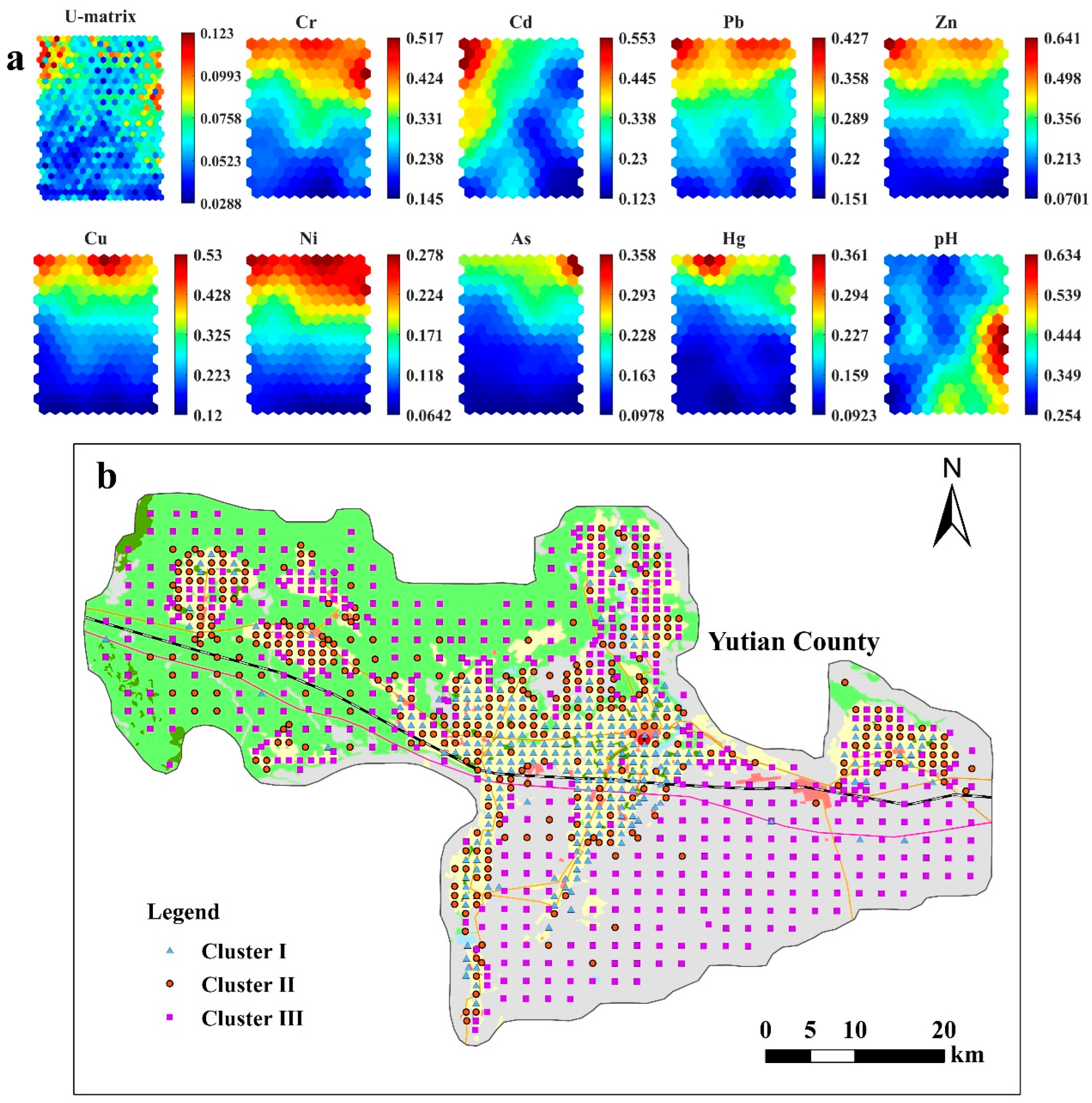- Wang, Z.; Xiao, J.; Wang, L.; Liang, T.; Guo, Q.; Guan, Y.; Rinklebe, J. Elucidating the differentiation of soil heavy metals under different land uses with geographically weighted regression and self-organizing map. Environ. Pollut. 2020, 260, 114065. [Google Scholar] [CrossRef]