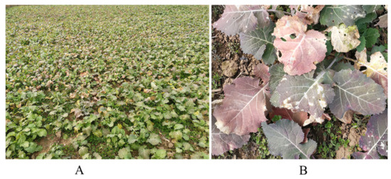 BrYV symptoms on oilseed rape plants in field of Nanjing. (A): Visible symptoms of BrYV-infected oilseed rape plants in field. (B): Red and purple leaf symptoms in BrYV-infected oilseed rape plants.