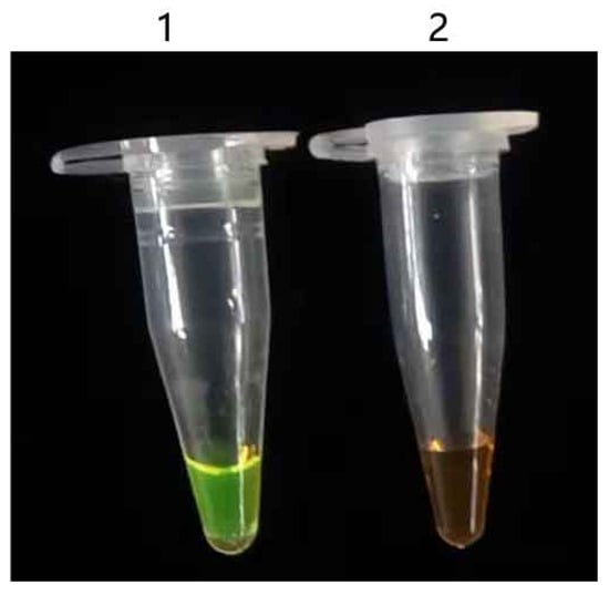Calcein was used as the fluorescence indicator. After the reaction ended, positive samples turned green while negative samples retained their original orange color. The detection results could be directly judged by observing these color changes (Figure 4).