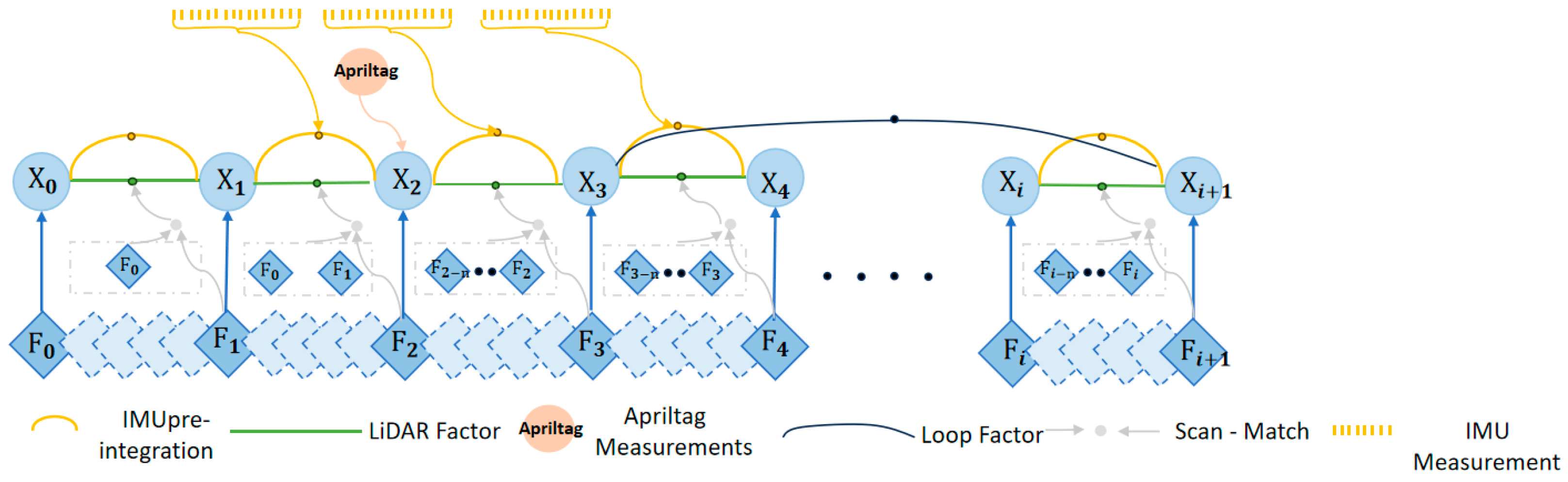 - A General Framework for Visual-Enhanced LiDAR Inertial Odometry: This work presents a principled methodology for embedding sparse but high-fidelity visual fiducial markers into a tightly coupled LiDAR inertial odometry framework. The core contribution is to propose a method of integrating the Apriltag factor instead of the original GNSS factor into the factor graph, which provides global constraints and cumulative error correction for the robot in the GNSS-denied environment. By designing a tightly coupled Apriltag factor within the LIO-SAM backbone, we achieve more than just the substitution of GNSS. The system is specifically engineered to handle the intermittent nature of visual observations, effectively leveraging sporadic tag detections to correct long-term drift without relying on continuous GNSS signals. This approach effectively bridges the gap between dense, relative LiDAR measurements and sparse, absolute visual detections, establishing a generalizable paradigm for enhancing state estimation in GNSS-denied environments beyond the specific case of Apriltags.