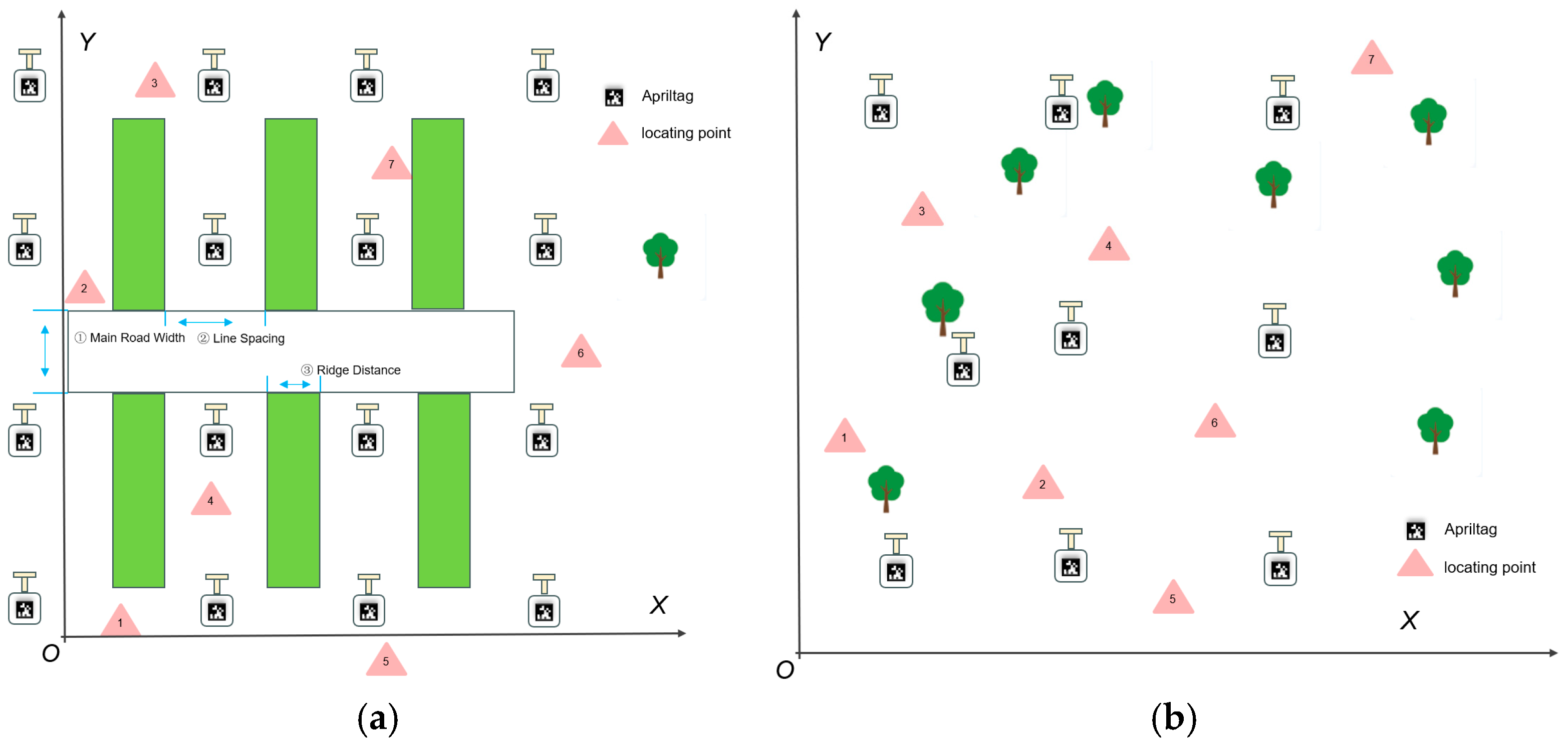 - A Systematic Deployment Framework for Visual Fiducial Makers: A key contribution of this work is to transform the deployment of tags from a temporary process to a systematic, principle-driven practice. Through rigorous experiments, we established a quantitative relationship between tag spacing and positioning accuracy. We determined that the spacing of 3 m is an optimal balance point, which can achieve centimeter-level accuracy (0.06 m RMSE) while ensuring actual deployment efficiency. In addition, this study further proposes a systematic deployment strategy: the vertical bracket is used to deploy Apriltag vertically, and its spatial density can be flexibly adjusted according to different positioning accuracy requirements. This strategy fundamentally reduces the complexity and cost of large-scale deployment, making scalable and reliable deployment possible in a broad agricultural environment.
