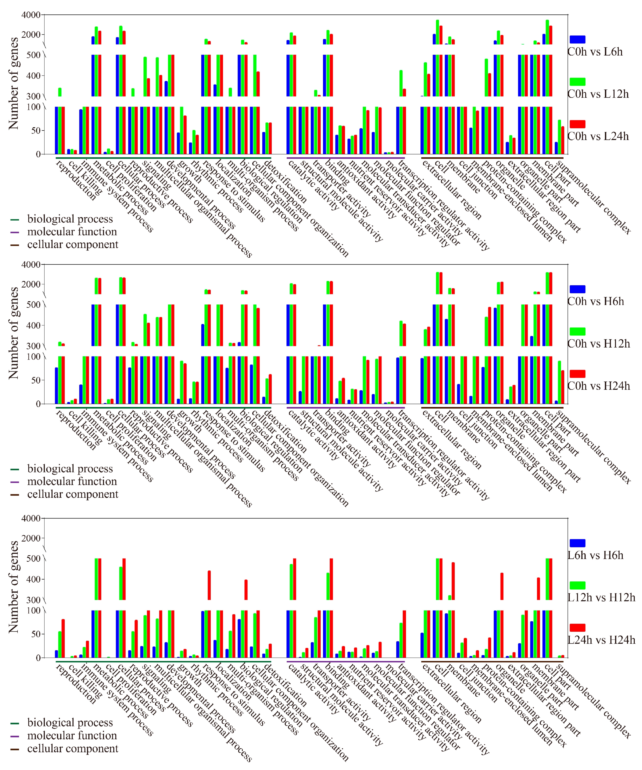 3.2.3. GO Annotation Analysis of DEGs Among Different Treatments
