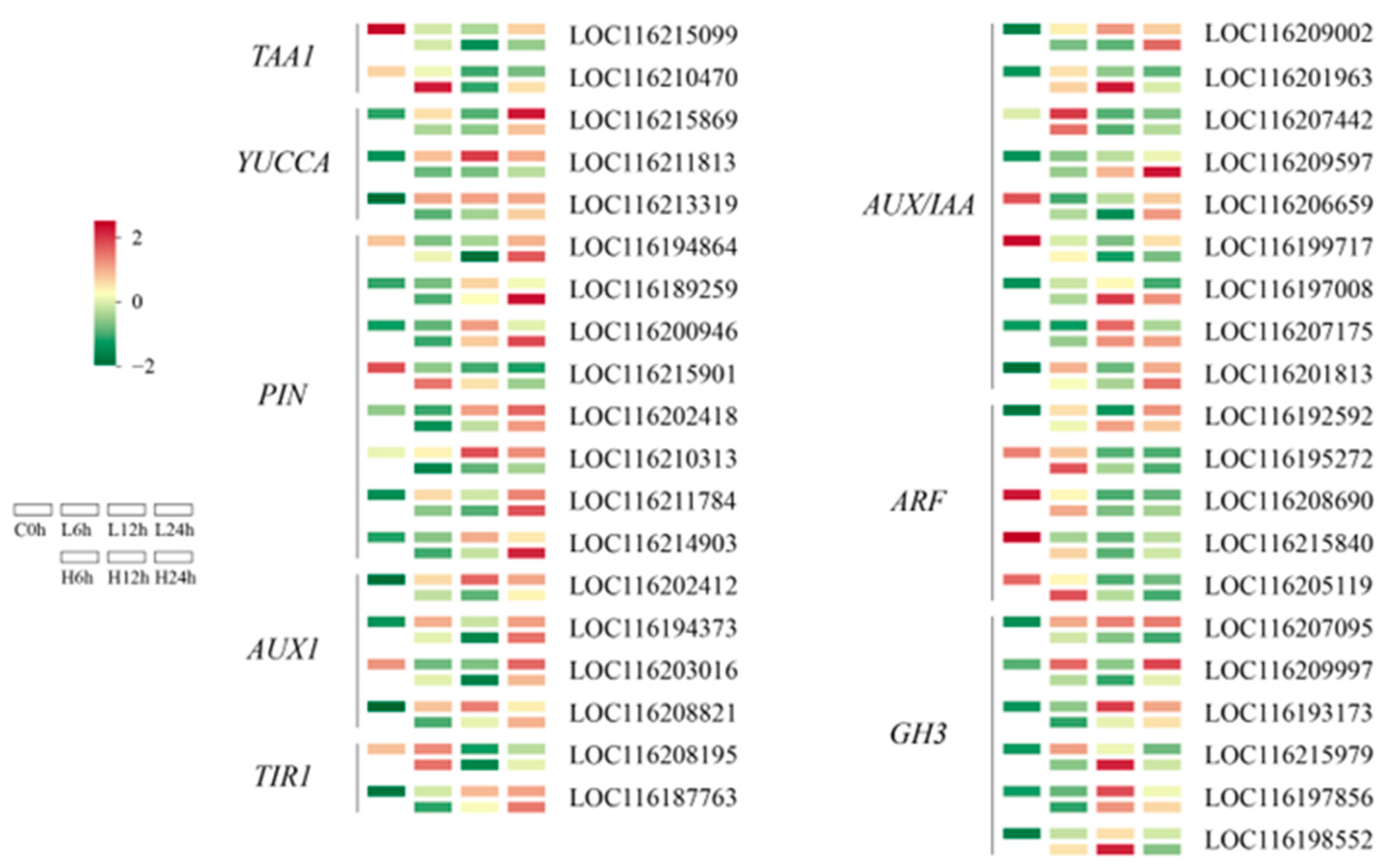 3.2.5. Analysis of Key Genes Involved in Auxin Biosynthesis and Signal Transduction