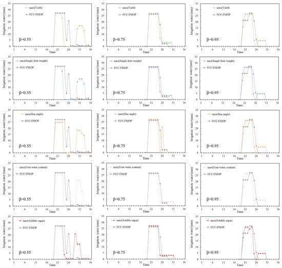 Compared with single-objective models, the FCC-FMOP model makes trade-offs among different objectives by regulating the water deficit degree and irrigation time, especially at the zenith fruiting stage. For β = 0.55 and 0.75, the FCC-FMOP model decreases the water consumption after i = 27. For β = 0.95, compared with single-objective models, the FCC-FMOP model increases irrigation water before t = 26 and reduces irrigation water after t = 26. The results in Figure 6 show the responses of irrigation strategies to multiple objectives but cannot show the associated yield and quality indicators.