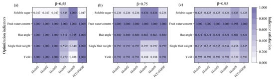Distribution of objective satisfaction for the FCC-FMOP model and single-objective models when β = 0.55 (a), 0.75 (b), and 0.95 (c). Model 1: maximizing yield; model 2: maximizing single fruit weight; model 3: maximizing hue angle; model 4: maximizing fruit water content; model 5: maximizing soluble sugar.