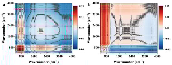 2D-FTIR-COS (a) synchronous spectra and (b) asynchronous spectra of RHB.
