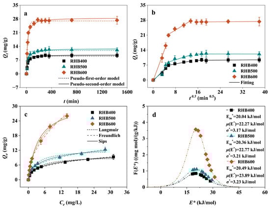The intra-particle diffusion model fitting results (Figure 2b, Table S2) showed that the fitted lines for the diffusion stage did not pass through the origin, indicating that both surface adsorption and intra-particle diffusion controlled the adsorption rate []. The larger intercept for RHB600 compared to RHB400 and RHB500 suggests a greater contribution from surface adsorption, consistent with its richer surface functional group structure. The multi-linearity in the intra-particle diffusion plot is frequently observed and suggests that adsorption occurs through a multi-step process, starting with boundary layer diffusion and followed by intra-particle diffusion, which is a common pattern in porous biochar adsorbents [].
