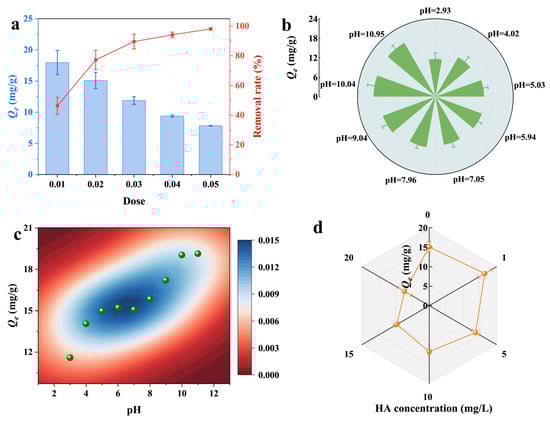 The dosage of RHB600 significantly influenced DIN removal (Figure 4a). At lower dosages (<0.02 g in this study), the adsorption capacity of DIN increased with the RHB600 dose because DIN was in excess and could fully occupy the available adsorption sites []. Since the initial DIN concentration was fixed, adding more than 0.02 g of RHB600 provided abundant total adsorption sites, sufficient to accommodate all DIN molecules in the system. This resulted in underutilization of some sites and a consequent decrease in the apparent adsorption capacity []. The DIN removal efficiency increased from 46.30% to 77.19% as the RHB600 dosage rose from 0.01 g to 0.02 g. Further increases in dosage did not significantly improve removal efficiency. Therefore, a dosage of 0.02 g was identified as optimal for this system.