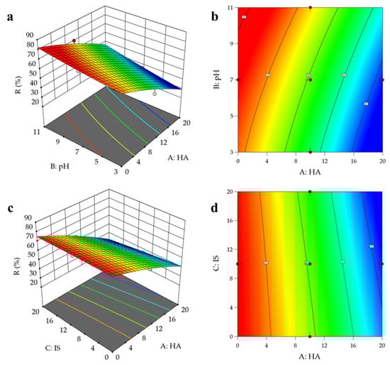 Effect of solution pH–HA–IS concentration on adsorption capacity of RHB600: (a,c) the response surface diagram of RHB600, (b,d) the contour map of RHB600.
