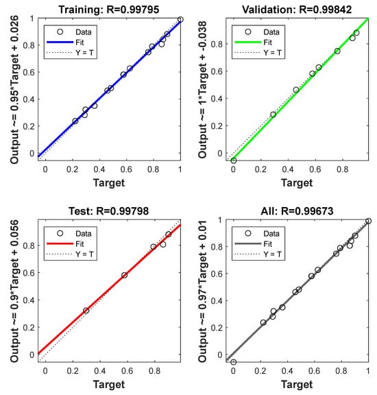 The experimental dataset was divided into 70% for training, 15% for testing, and 15% for validation to enhance the reliability and generalizability of the ANN model. A suitable ANN topology was established after 5 iterative training (Figure S9). Figure 6 shows that the correlation coefficients (R) for the training, testing, and validation phases of the ANN model all exceeded 0.99, indicating a highly satisfactory response of this topology for predicting RHB600 adsorption []. The predicted DIN removal efficiencies under the trained ANN topology showed excellent agreement with the experimental values, demonstrating the model’s capability for predicting removal efficiency under specific conditions of pH, ionic strength, and HA concentration.