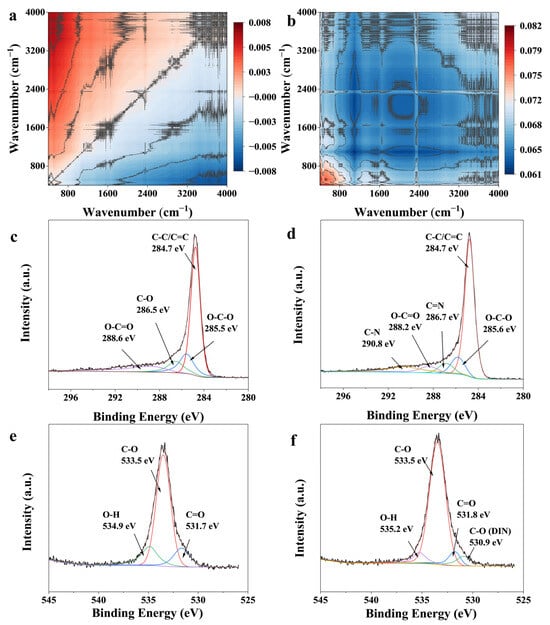 These 2D-COS results indicate that with increasing pyrolysis temperature, the organic polar groups and aromatic framework of RHB undergo rapid reorganization and partial removal below 500 °C, while the mineral framework and surface silanols follow a slower, diffusion-limited reconstruction process above 500 °C [,,,]. This thermal evolution pattern suggests RHB400 primarily adsorbs DIN via polar sites and hydrogen bonding, while RHB600 tends to rely more on pore-filling, hydrophobic, and π–π interactions [].