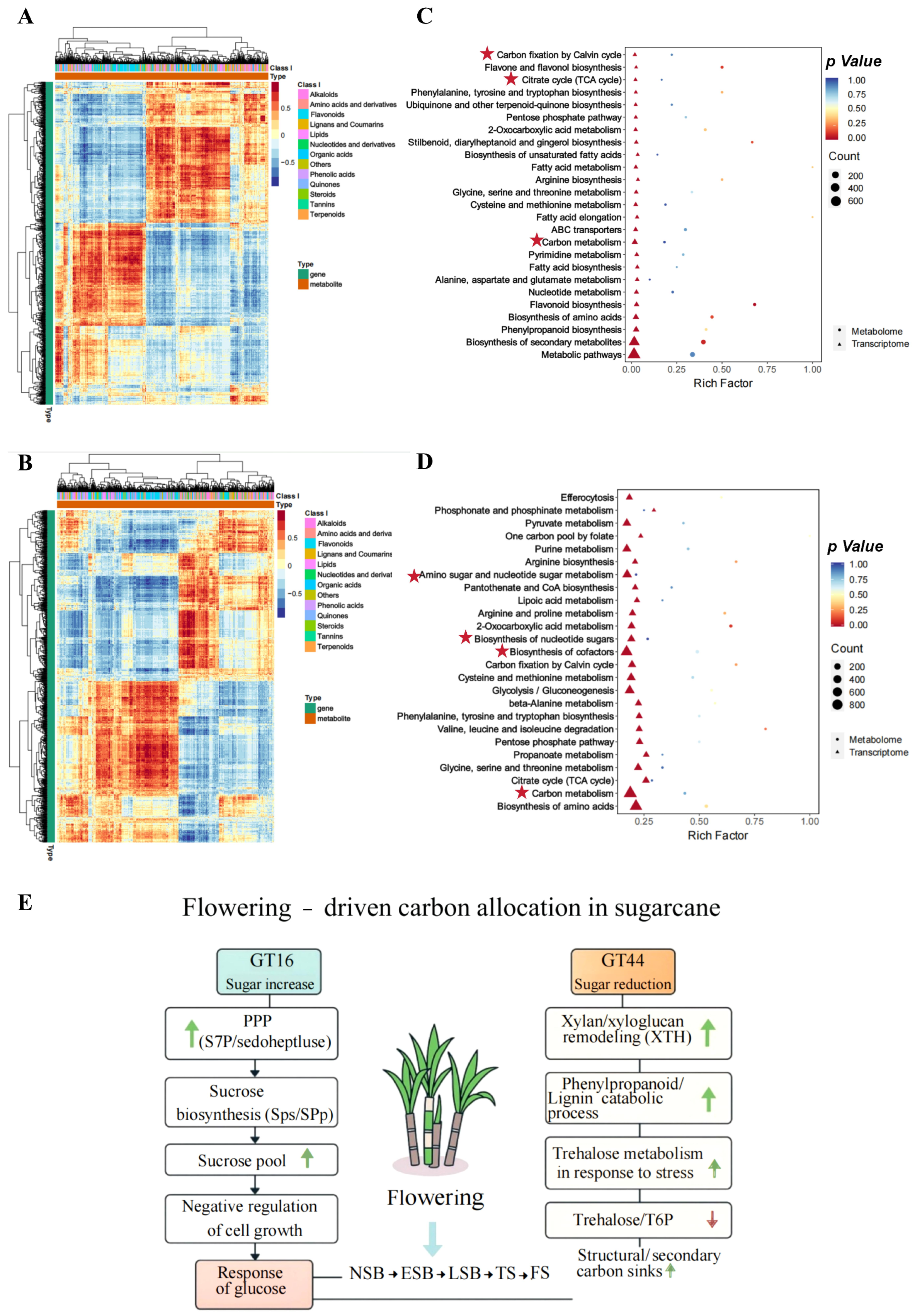 - Yuan, Z.; Dong, F.; Pang, Z.; Fallah, N.; Zhou, Y.; Li, Z.; Hu, C. Integrated Metabolomics and Transcriptome Analyses Unveil Pathways Involved in Sugar Content and Rind Color of Two Sugarcane Varieties. Front. Plant Sci. 2022, 13, 921536. [Google Scholar] [CrossRef]