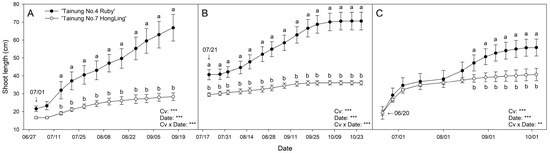 Shoot length of one-year-old shoot in ‘Tainung No. 4 Ruby’ (solid symbols) and ‘Tainung No. 7 HongLing’ (open symbols) in summer of 2022 (A), 2023 (B) and 2024 (C). Cv, Date, and Cv × Date indicate the effect of the cultivar, time, and interaction between the cultivar and time, respectively. ** and *** indicate treatment effects are significant at p < 0.01 and p < 0.001, respectively. Means and SE are presented. Means (n = 3–4) with different letters within each measurement day are significantly different at p < 0.05 (Fisher’s LSD test).