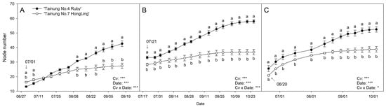 Node number of one-year-old shoot in ‘Tainung No. 4 Ruby’ (solid symbols) and ‘Tainung No. 7 HongLing’ (open symbols) in 2022 (A), 2023 (B) and 2024 (C). Cv, Date, and Cv × Date indicate the effect of the cultivar, time, and interaction between the cultivar and time, respectively. * and *** indicate treatment effects are significant at p < 0.05 and p < 0.001, respectively. Means and SE are presented. Means (n = 3–4) with different letters within each measurement day are significantly different at p < 0.05 (Fisher’s LSD test).