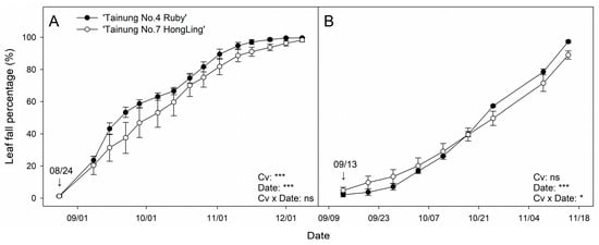 Leaf fall percentage of one-year-old shoot in ‘Tainung No. 4 Ruby’ (solid symbols) and ‘Tainung No. 7 HongLing’ (open symbols) in 2023 (A) and 2024 (B). Cv, Date, and Cv × Date indicate the effect of the cultivar, time, and interaction between the cultivar and time, respectively. *, *** and ns indicate treatment effects are significant at p < 0.05, p < 0.001 and not significant, respectively.
