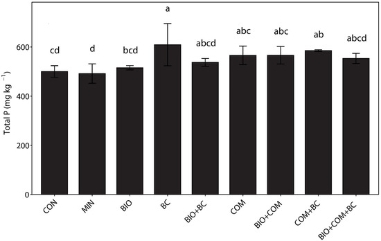 The effect of continuous application of BIO and BC soil amendments on the total soil phosphorus content (means ± SEM). Different letters denote significant differences at p < 0.05; error bars indicate standard error of the mean (n = 3); CON = Control, MIN = Mineral fertilizer, BIO = Biochar, BC = Bone char, BIO + BC = Biochar + bone char, COM = Compost, COM + BC = Compost + bone char, and BIO + COM + BC = Biochar + compost + bone char.