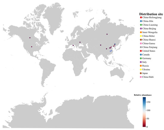 Geographical distribution of 306 soybean germplasm resources. Distribution site: Different colors indicate the distribution of enriched germplasm resources; Relative abundance: 0–150 represents the enrichment depth of germplasm resources. The darker the blue, the higher the abundance of germplasm resources; the darker the brown, the lower the abundance.