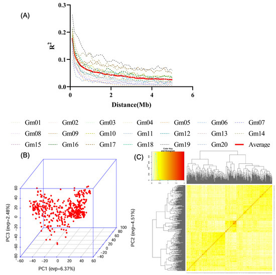Soybean Germplasm Population Genotype Analysis. (A): Genome-wide LD pattern; the dashed line denotes the LD decay curve of 20 chromosomes, and the solid red line represents the average decay curve of 20 chromosomes. (B): Principal Component Analysis (PCA). (C): Kinship analysis among individuals in the natural population. High-throughput omics data (gene expression abundance) clustering heatmap: The color bar at the top left corner indicates the correlation between values and colors (yellow/orange represents higher values). The dendrograms at the top and left sides show the clustering results, where samples and features are grouped based on the similarity in their expression/value patterns, respectively. The color of each cell in the middle matrix corresponds to the specific value of a particular gene in a given sample. Most areas in the figure are yellow, indicating that the expression levels of these features (genes) are generally high in the corresponding samples.