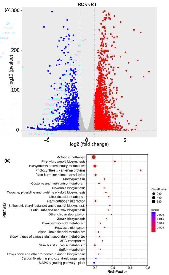 Analysis of gene expression levels and KEGG Enrichment (A): Volcano plot of differentially expressed genes between RC and RT (SCN-resistant DN L10 vs. SCN-susceptible HN37); Red: upregulated differentially expressed genes (DEGs); Blue: downregulated differentially expressed genes (DEGs); Dashed lines represent the selection criteria: log2FC > 1 and false discovery rate (FDR) < 0.05. (B): KEGG enrichment analysis of 25 pathways for differentially expressed genes.