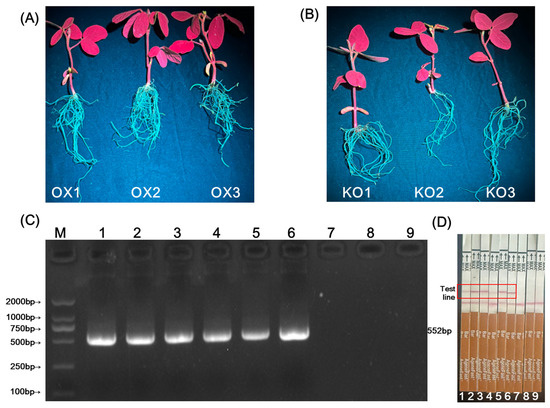 Agrobacterium tumefaciens strain K599 harboring gene-editing and overexpression recombinant vectors was genetically transformed into the roots of soybean at the second trifoliolate leaf stage (R2 stage). The roots of OX1-OX3 (overexpression lines) and KO1-KO3 (gene-editing lines) were irradiated with 440 nm excitation light using a handheld portable LUYOR-3415RG dual-wavelength fluorescent protein excitation light source LUYOR Instrument Co., Ltd., Shanghai, China; Cat. LUYOR-3415RG). The results showed that green fluorescence was observed in the plant roots (Figure 5A). At the protein level, transformed hairy roots were detected using BAR test strips. The results showed that positive signals were observed in the test lines of the BAR test strips for the roots of OX1-OX3 and KO1-KO3, while negative signals were observed in the test lines of the BAR test strips for wild-type (WT) roots (Figure 5D). At the DNA level, detection using specific primers (BAR-F/R) showed that clear electrophoretic bands appeared at 552 bp for the roots of OX1-OX3 and KO1-KO3 (Figure 5B). Sequencing results confirmed that these bands matched the exogenous BAR (bialaphos resistance gene). No electrophoretic bands were observed in WT roots (Figure 5B). In conclusion, soybean hairy roots with overexpression (OX) and gene editing (KO) were successfully obtained.