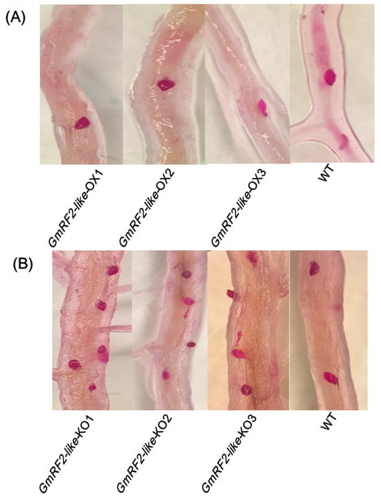 Results of SCN Disease Phenotypic Identification. (A): GmRF2-like-OX1-3: Phenotypic identification of SCN in GmRF2-like-overexpressing roots; (B): Phenotypic identification of SCN in WT roots. The red spots in the roots represent female nematodes stained with acid fuchsin solution per unit area.