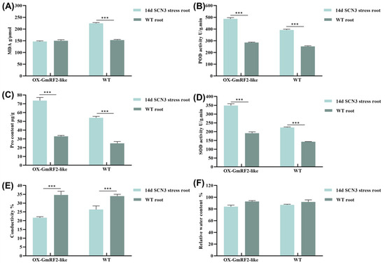 Determination of SCN 3 stress-related indices in transgenic root systems. (A) Determine the MDA content of OX-GmRF2-like and WT (DN50); (B) Determine the POD content of OX-GmRF2-like and WT (DN50); (C) Determine the Pro content of OX-GmRF2-like and WT (DN50); (D) Determine the SOD content of OX-GmRF2-like and WT (DN50); (E) Determine the relative electrical conductivity of OX-GmRF2-like and WT (DN50); (F) Determine the relative water content of OX-GmRF2-like and WT (DN50); p < 0.001: Extremely significant (Marked with three asterisks, ***).