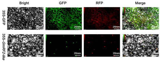 Subcellular Localization Analysis of GmRF2-like-Encoded Protein. Bright: Bright field; GFP: Green fluorescent protein field; RFP: Red fluorescent protein field (nuclear localization Marer); Merge: Merged field; 35S-GFP: Results of tobacco infiltration with Agrobacterium tumefaciens GV3101 (p-soup19) harboring pCAMBIA1302-GFP; 35S-GmRF2-like: Results of tobacco infiltration with Agrobacterium tumefaciens GV3101 (p-soup19) transformed with pCAMBIA1302-GmRF2-like.