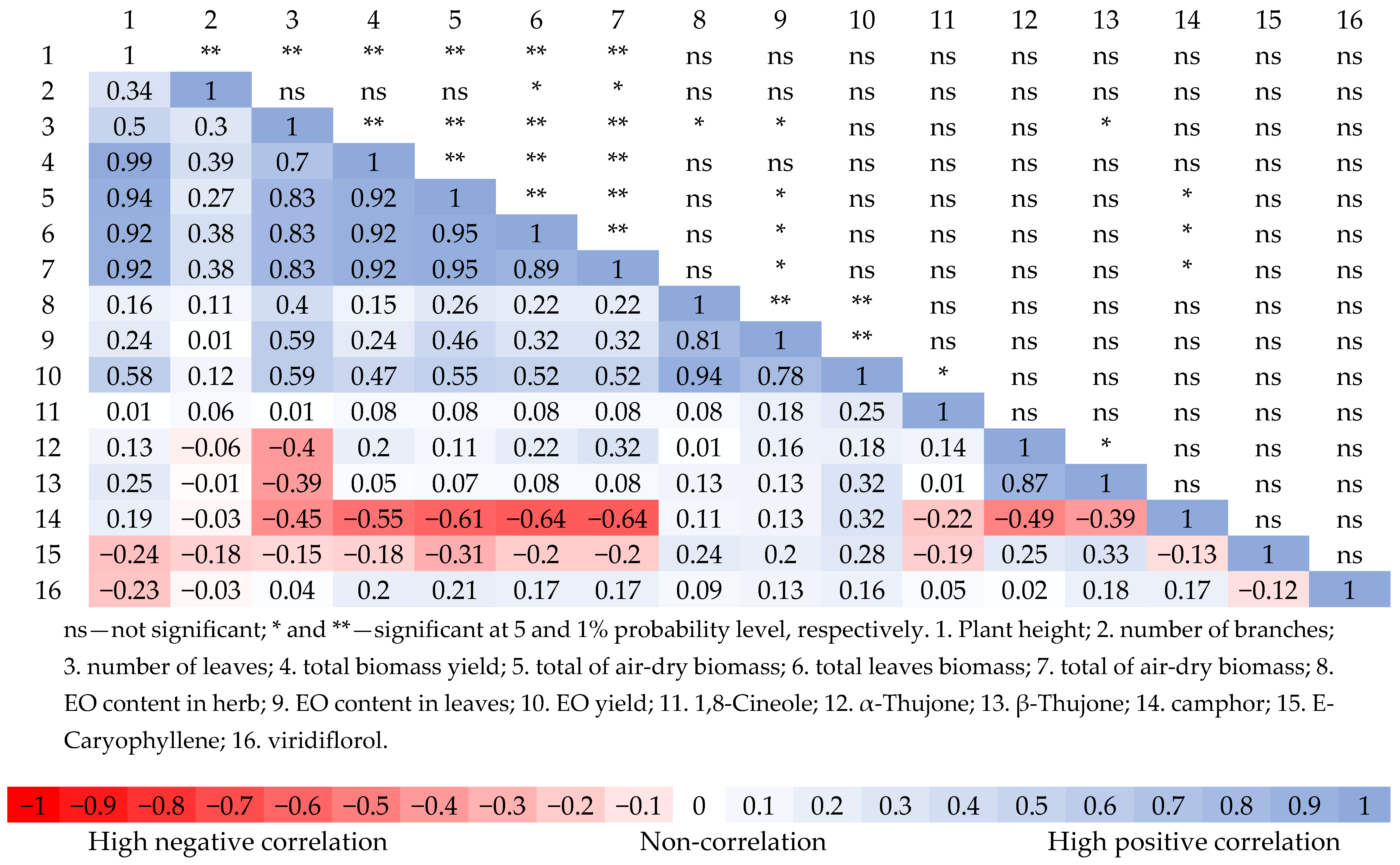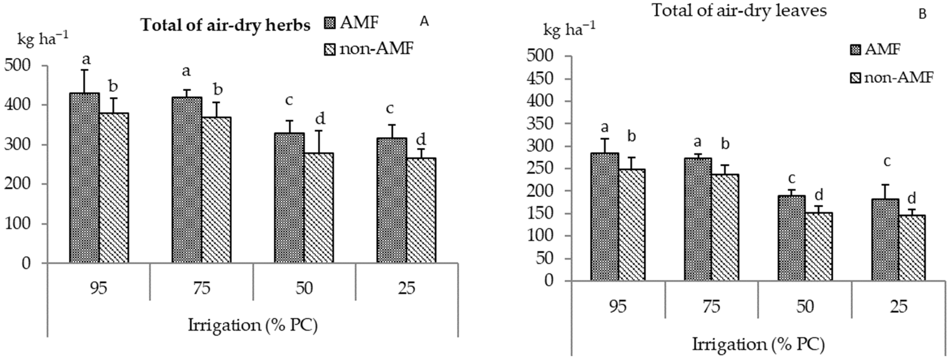| Treatments | Total of Air-Dry Biomass | Total of Air-Dry Leaves | EO Content in Herb | EO Content in Leaves | EO Yield |
