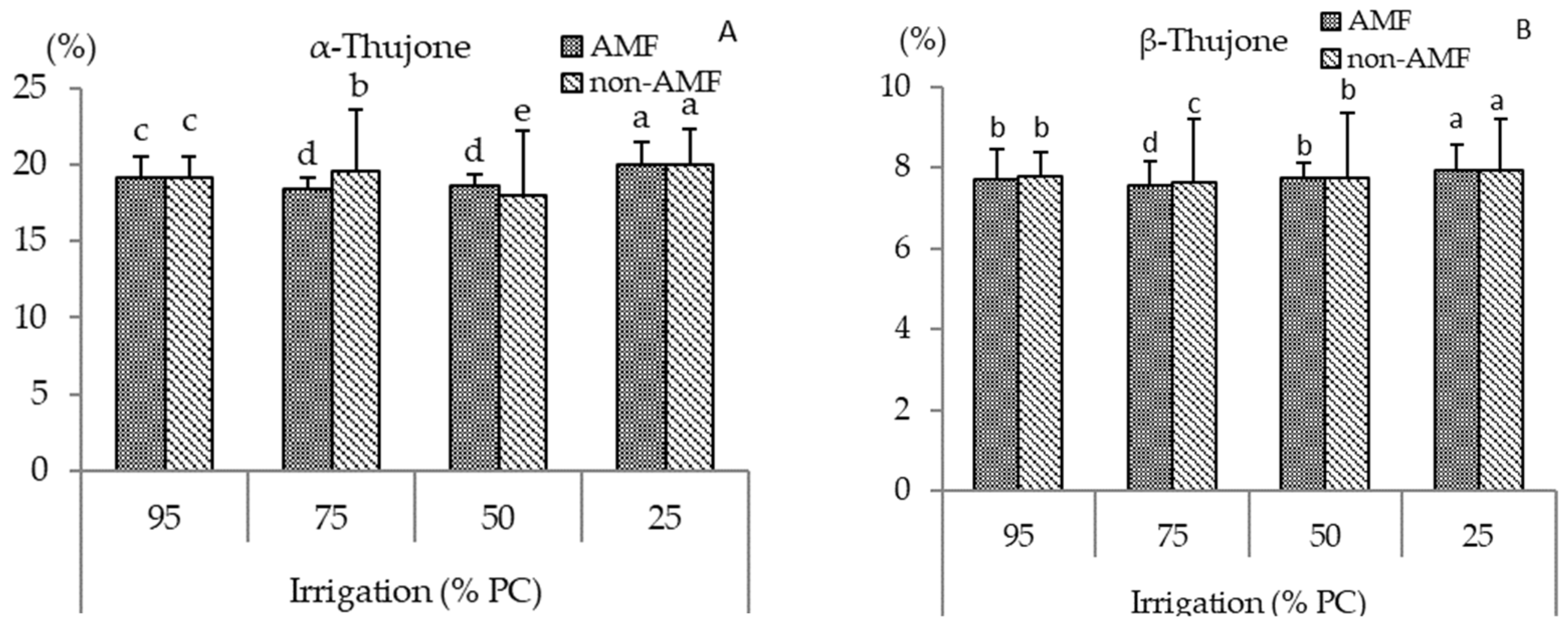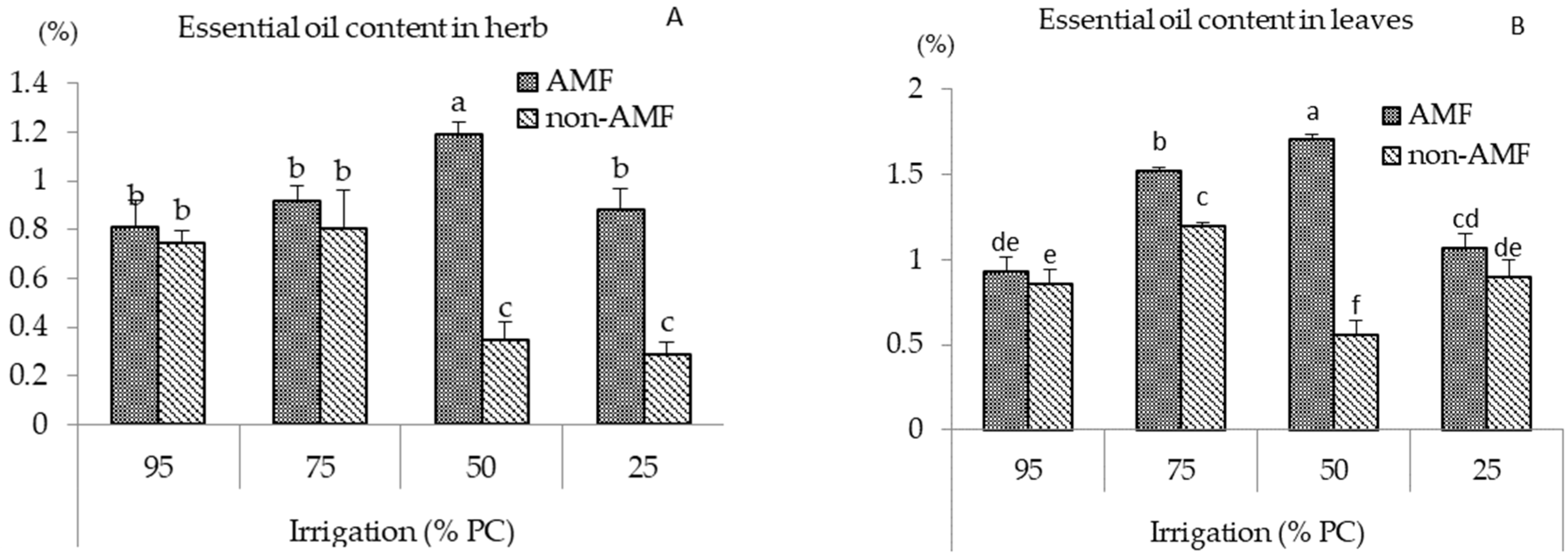 - Arpanahi, A.A.; Feizian, M.; Mehdipourian, G.; Khojasteh, D.N. Arbuscular mycorrhizal fungi inoculation improves essential oil and physiological parameters and nutritional values of Thymus daenensis Celak and Thymus vulgaris L. under normal and drought stress conditions. Eur. J. Soil. Biol. 2020, 100, 103217. [Google Scholar] [CrossRef]