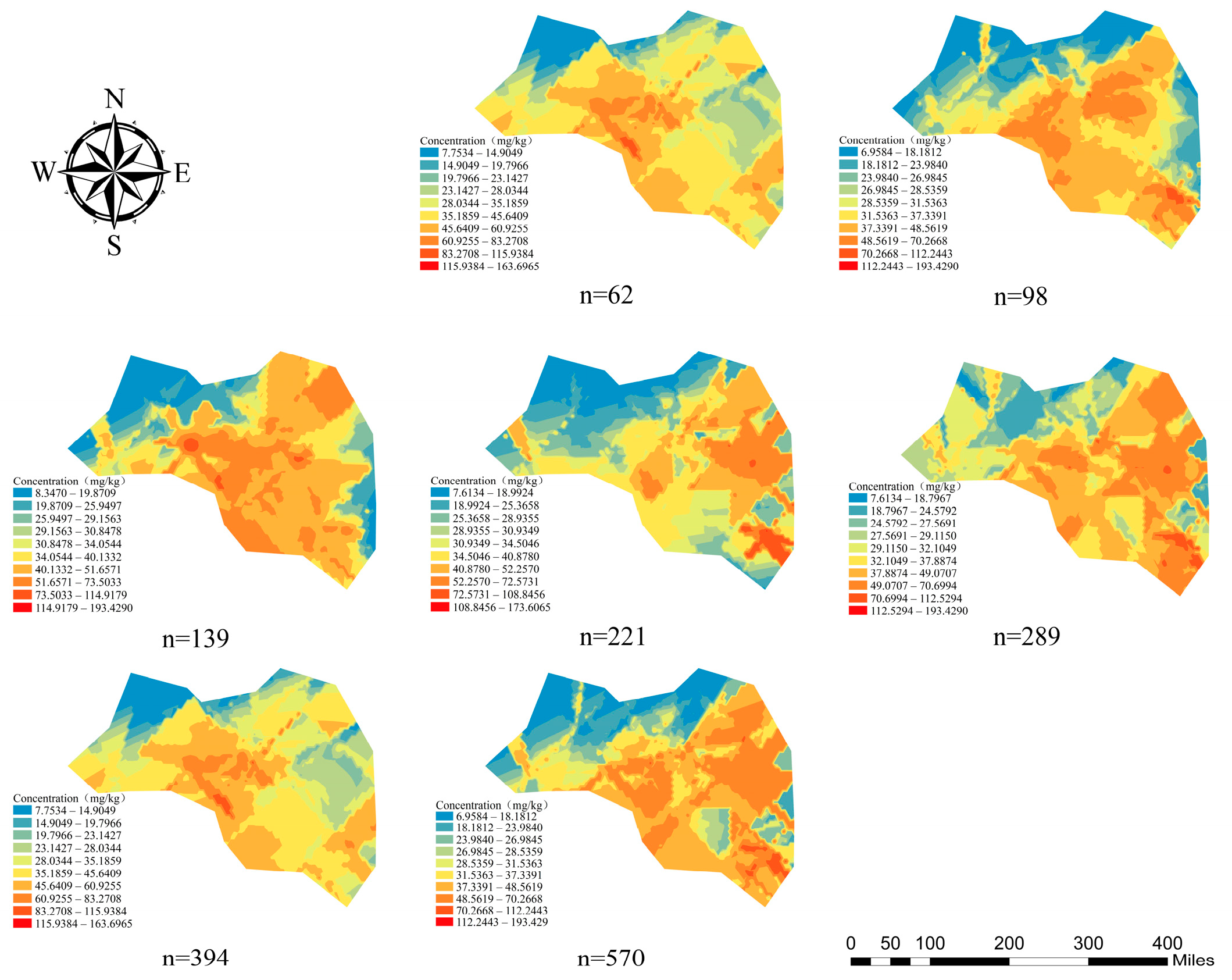 - Li, K.; Du, H.F.; Wu, K.N.; Jiang, H.L.; Liu, P.J.; Xu, W.W. Suitable Interpolation Method and Reasonable Sampling Quantity of Cd Pollution Index in Soil. Chin. J. Soil Sci. 2016, 47, 1056–1064. [Google Scholar]