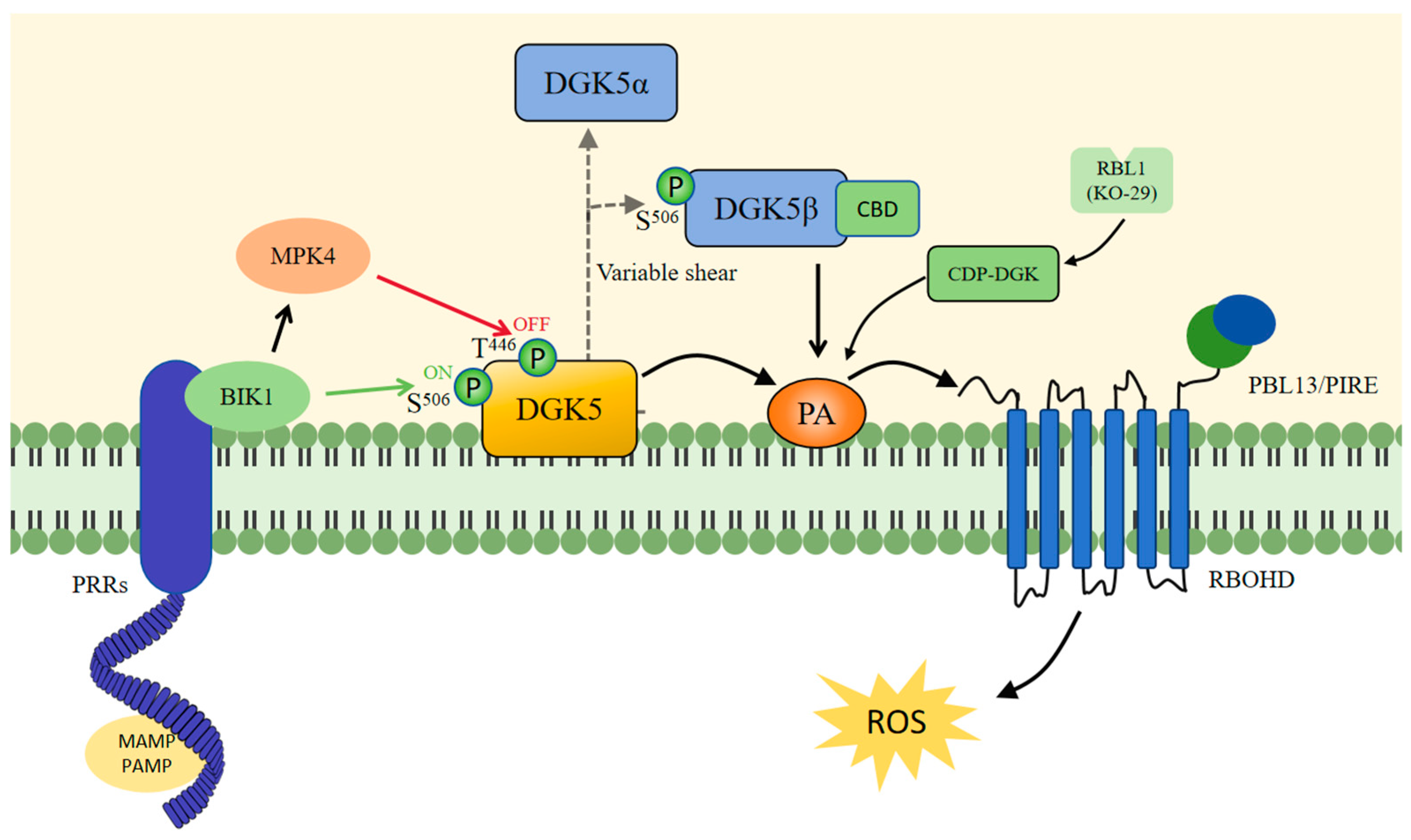 - Kong, L.; Ma, X.; Zhang, C.; Kim, S.I.; Li, B.; Xie, Y.; Yeo, I.; Thapa, H.; Chen, S.; Devarenne, T.P.; et al. Dual phosphorylation of DGK5-mediated PA burst regulates ROS in plant immunity. Cell 2024, 187, 609–623. [Google Scholar] [CrossRef] [PubMed]