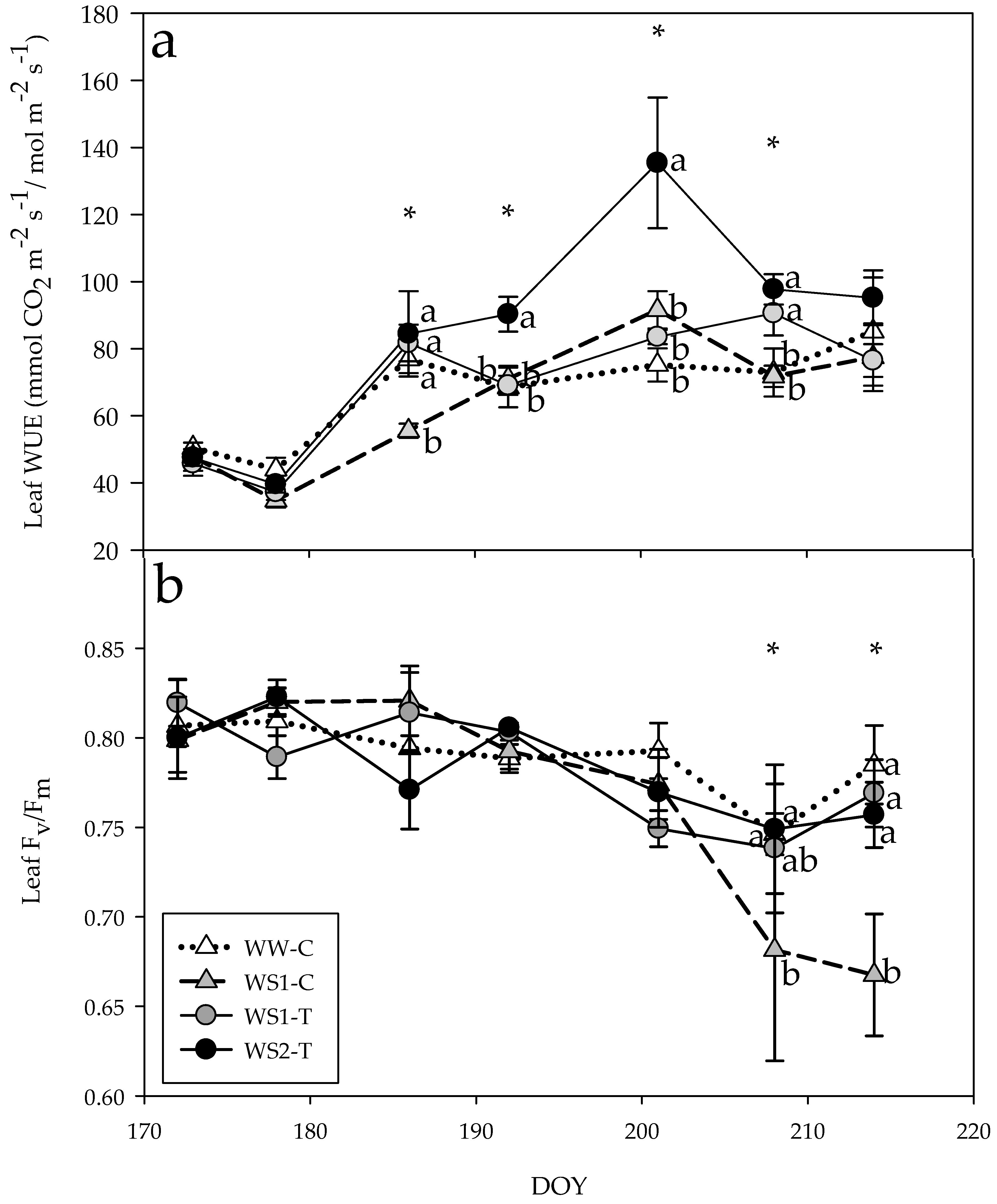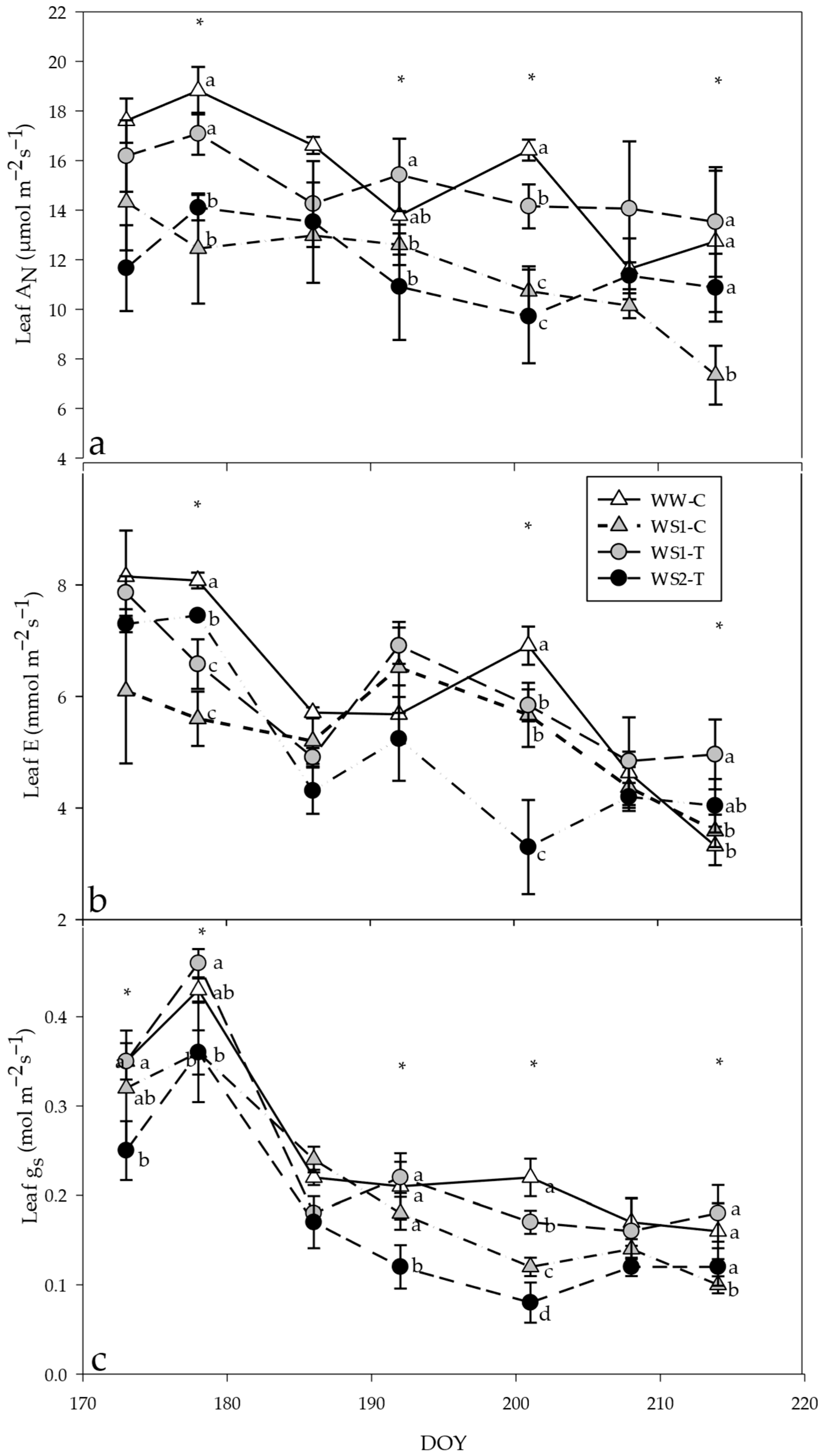 - Severe irrigation reduction treated vines (WS2-T): These vines were irrigated daily at 40% ET, averaging 2 L per vine per day, from DOY 171 to DOY 214, and were subjected to multiple foliar applications of a proline-rich SYD.