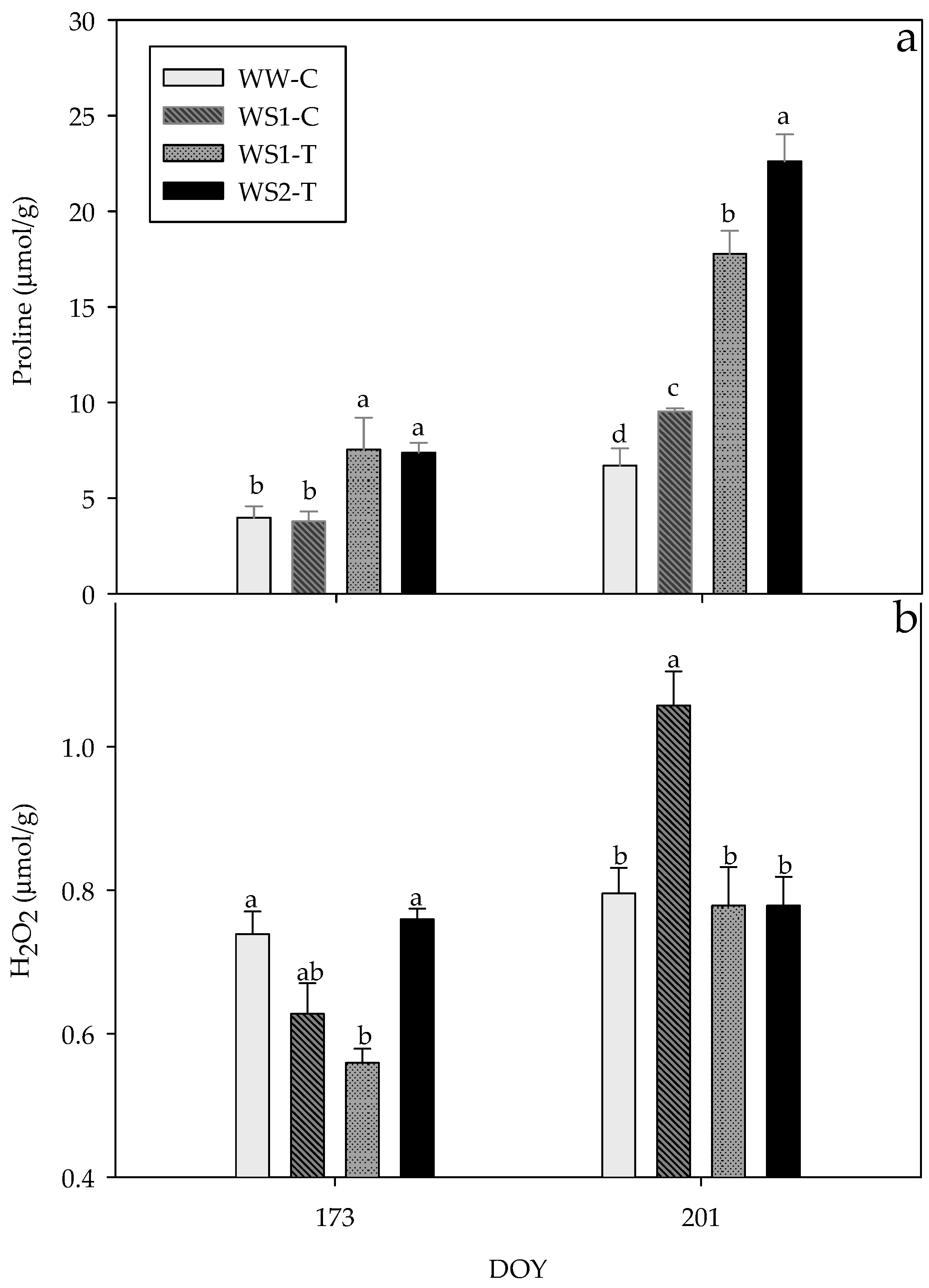 - Moderate irrigation reduction treated vines (WS1-T): These vines also received daily irrigation at 80% ET, averaging 4 L per vine per day, from DOY 171 to DOY 214, and were subjected to multiple foliar applications of a proline-rich SYD.