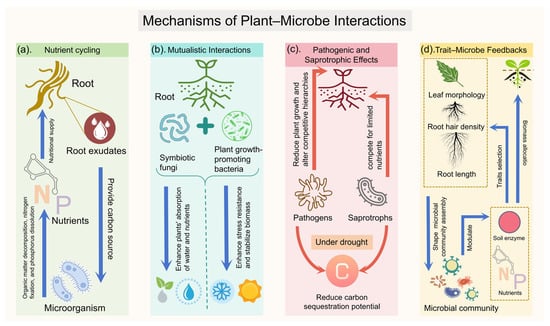 Conceptual model of plant–microbe interaction mechanisms that regulate grassland productivity. Panels show (a) nutrient cycling mediated by root exudates and microbial mineralization/immobilization, (b) mutualistic interactions between roots, symbiotic fungi, and plant-growth-promoting bacteria, (c) pathogenic and saprotrophic effects that reduce plant growth and compete for limited nutrients (especially under drought), and (d) trait–microbe feedbacks linking plant traits (leaf morphology, root length and hair density) with microbial community composition, enzyme activity, and soil nutrients. Blue arrows indicate positive effects on the targeted component; red arrows indicate negative effects. Abbreviations: N, nitrogen; P, phosphorus; C, carbon.