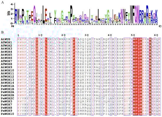 Conserved homeodomain analysis of WOX family members in passion fruit. (A) The logo in Arabidopsis thaliana and passion fruit. (B) Alignment of the WOX homodomain sequences in passion fruit.