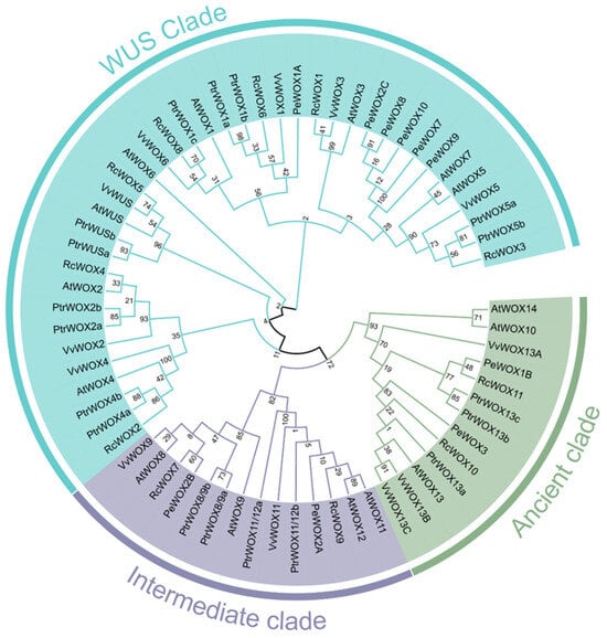 The eukaryotic superfamily of homeobox (HB) TFs is characterized by a small segment of the amino acid (60–66 residues), which can fold to form a triple-helix structure that can specifically bind to DNA [,]. HB TF serves as a pivotal developmental regulator in eukaryotes []. WUSCHEL (WUS) homeobox TF is a member of the WUS homeobox (WOX) protein family, which is a plant-specific subfamily of the homeobox TF superfamily. Extensive research has demonstrated that WOX TFs are crucial regulators of diverse plant developmental processes, including embryogenesis, stem cell niche maintenance, and organogenesis []. WOX genes are ubiquitously distributed across the plant kingdom, extending from basal chlorophytes to advanced angiosperms. However, it was not found in red algae, indicating that the WOX family may originate from green algae. The number of WOX genes in different plants is different, and the number increases with the evolution of plants. For example, there is only one WOX gene in unicellular green algae, three in moss, six in Selaginella, and fifteen in Arabidopsis []. According to the evolutionary relationship, WOX members can be divided into three evolutionary clades: WUS clade, intermediate clade, and ancient clade. The WOX genes of lower plants are only distributed in the ancient clade, while those of higher plants are distributed in these three evolutionary clades [].