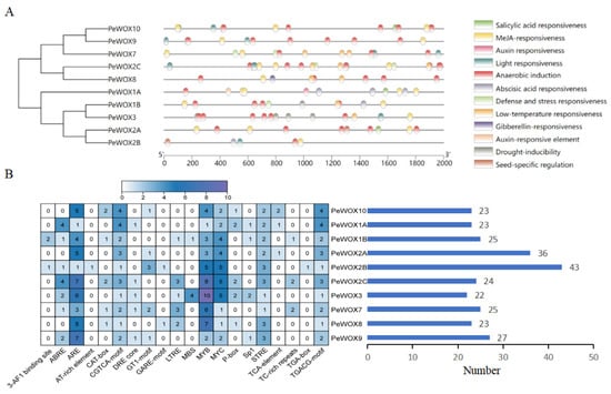 The cis-regulatory element on the putative promoter of the PeWOX genes. (A) Distribution of cis-regulatory elements identified in the 2000 bp upstream promoter region of PeWOX genes. (B) The number of cis-regulatory elements on putative promoters of PeWOX genes.