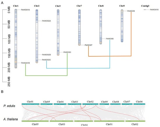 Chromosomal distribution and synteny analysis. (A) Chromosomal distribution and gene duplications of PeWOXs. The segmental duplicated genes are linked by lines. The scale bar on the left indicates the length (Mb) of passion fruit chromosomes. (B) Synteny analysis of the WOX genes between passion fruit and Arabidopsis thaliana. Gray lines in the background indicate the collinear blocks between the passion fruit and Arabidopsis thaliana genomes, and the red lines highlight the syntenic WOX gene pairs.