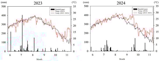 This experiment was conducted at a field with an elevation above 200 m, located in Goesan (36°48′18″ N 127°44′52″ E), Chungcheongbuk-do, South Korea, for two years, 2023 and 2024. The ATMOS-41 weather sensors (METER-Group, Pullman, WA, USA) were installed to monitor temperature and precipitation in the field, and both data were collected at 15 min intervals throughout the experiment. The data of rainfall, temperature, and ten-year mean temperature during the experiment period (late May to early November) are shown in Figure 1.