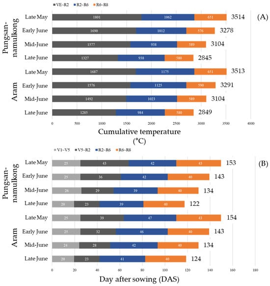 (A) Cumulative temperature (°C) and (B) growing days required to reach each developmental stage (VE–R2, R2–R6, and R6–R8) in Pungsannamulkong and Aram under four sowing dates.