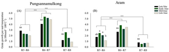 Effect of unit temperature (100 °C) on seed maturity during reproductive stage (R5–R8). (A) Pungsannamulkong; (B) Aram. Different letters on a bar indicate a significance at p < 0.05 by Tukey’s HSD test. ns, no significance; *** p < 0.001.