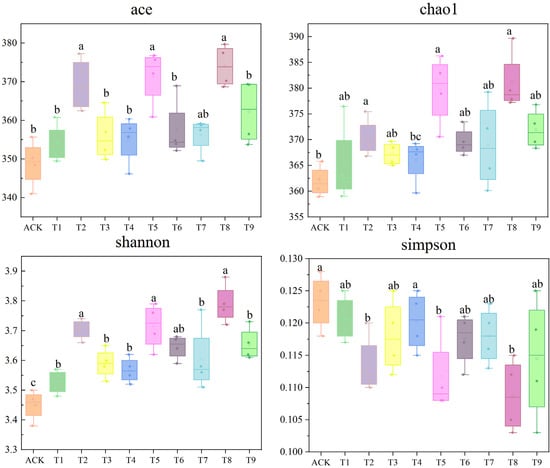 In environmental microbiology, Alpha diversity analysis is used to assess the species richness and evenness within a community. Richness, which estimates the total number of species, is represented by the Chao1 and ACE indices. Diversity, which reflects both species evenness and the dominance of certain species, is comprehensively measured by the Shannon and Simpson indices. Together, these metrics reveal the ecological complexity and stability of the soil microbial community. The effects of different microbial fertilizer treatments on the fungal community diversity in the rhizosphere soil of the salt–alkali-tolerant sunflower variety NX53177 are shown in Figure 1. Under treatments T1–T9, the species richness index (ace) increased by 1.45%, 5.85%, 2.04%, 1.78%, 6.46%, 2.47%, 2.12%, 7.21%, and 3.83%, respectively, compared to ACK. The Chao1 index increased by 0.90%, 2.34%, 1.47%, 1.15%, 4.91%, 2.14%, 1.96%, 5.31%, and 2.78%, respectively. The species diversity index (Shannon) increased by 2.32%, 7.54%, 4.06%, 3.48%, 7.83%, 5.80%, 4.64%, 9.86%, and 6.09%, respectively. The Simpson index of community dominance decreased by 8.78%, 21.49%, 12.40%, 12.19%, 25.10%, 15.81%, 14.77%, 25.83%, and 21.49%, respectively. Among all microbial fertilizer treatments, the T8 treatment increased the Shannon diversity index by 9.86% and decreased the Simpson index by 25.83% compared to ACK, indicating that the T8 treatment can effectively increase the species diversity level of the rhizosphere soil fungal community.