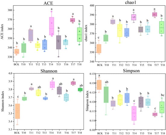 The effects of different microbial fertilizer treatments on the fungal community diversity in the rhizosphere soil of the non-salt–alkali-tolerant sunflower variety NKY1502 are shown in Figure 2. Under treatments T10-T18, the species richness index (ace) increased by 1.08%, 5.10%, 1.86%, 2.08%, 8.04%, 2.87%, 2.86%, 10.00%, and 5.35%, respectively, compared to BCK. The Chao1 index increased by 3.18%, 8.91%, 5.47%, 4.91%, 9.49%, 5.79%, 5.93%, 10.34%, and 6.41%, respectively. The species diversity index (Shannon) increased by 4.53%, 7.93%, 6.52%, 4.53%, 9.35%, 7.37%, 4.82%, 9.92%, and 7.65%, respectively. The Simpson index of community dominance decreased by 4.03%, 7.75%, 6.20%, 5.43%, 11.78%, 7.13%, 7.13%, 12.17%, and 9.23%, respectively. Among all microbial fertilizer treatments, the T17 treatment increased the species richness (ACE index) and community diversity (Shannon index) of the sunflower rhizosphere soil fungal community by 10.00% and 9.92%, respectively, while decreasing the community dominance (Simpson index) by 12.17% compared to BCK. This indicates that the T17 treatment had the most significant effect on improving the diversity of the rhizosphere soil fungal community. Microbial fertilizers can increase the richness and species diversity of the soil fungal community while decreasing its dominance, thus regulating the rhizosphere soil microbiome.